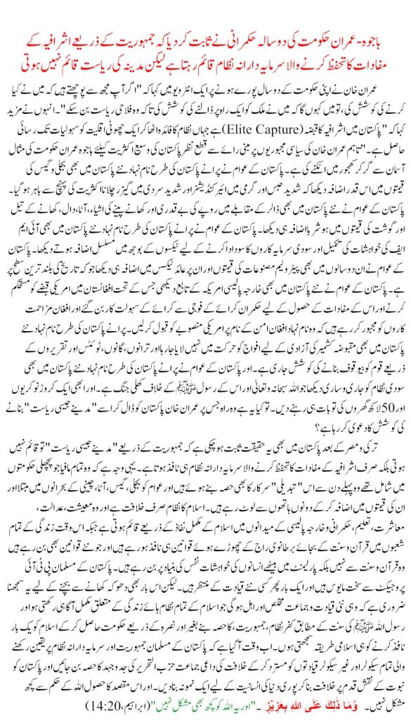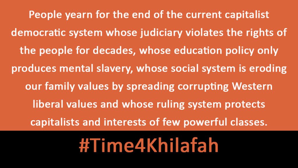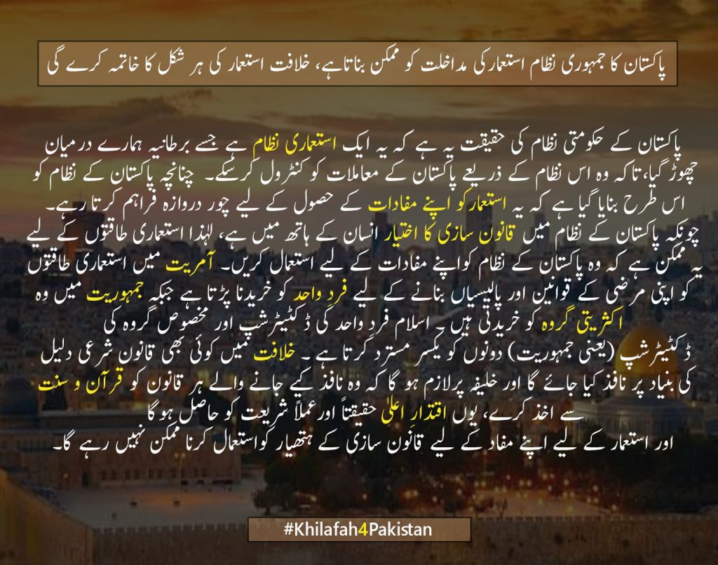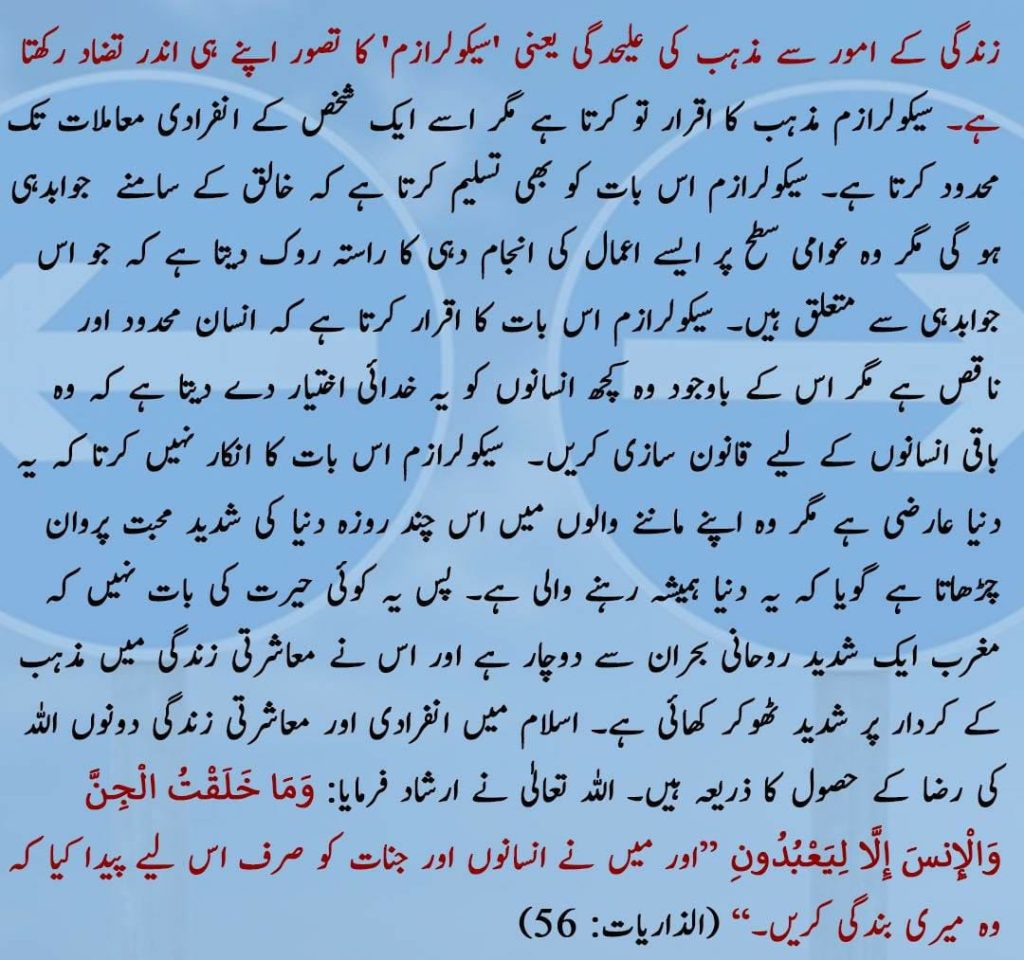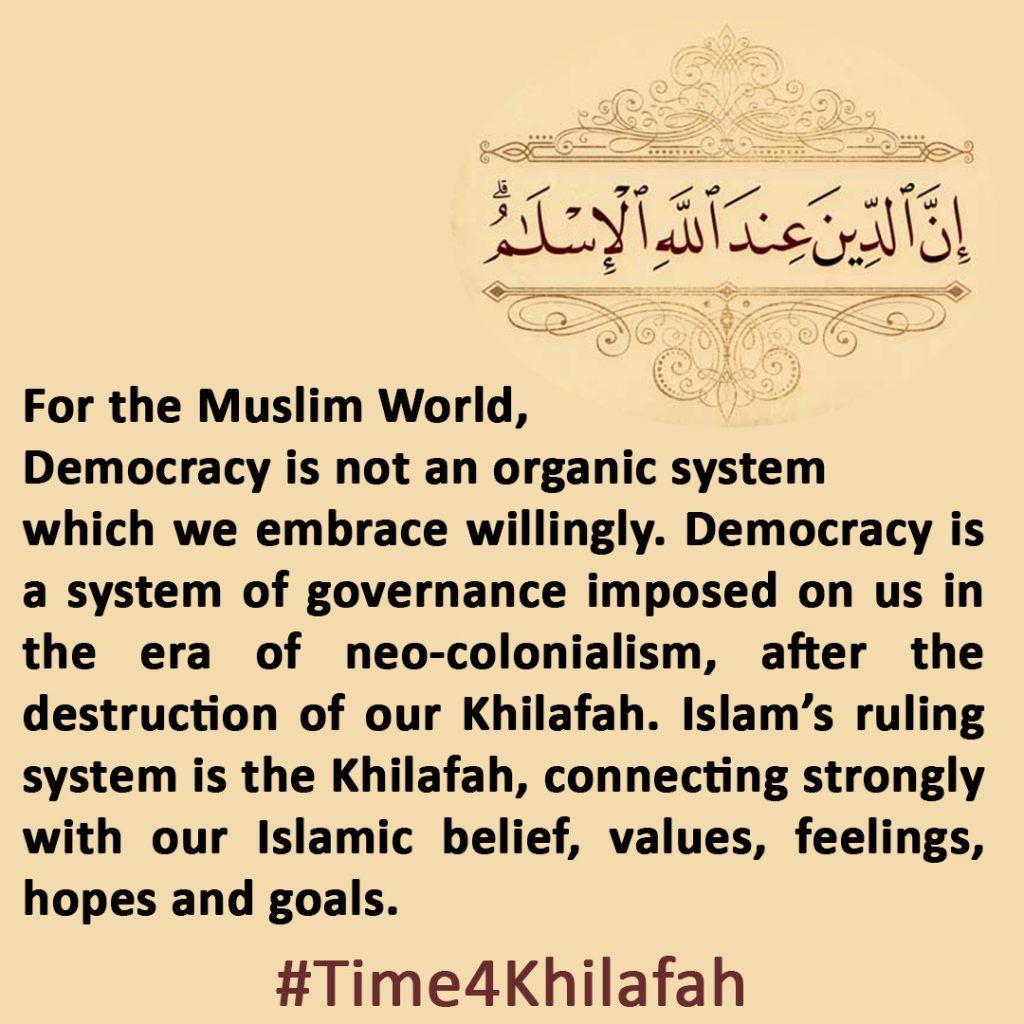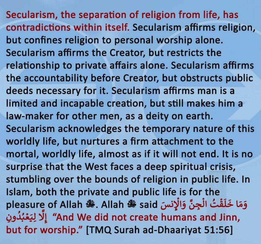 After the destruction of the Islamic foundation Khilafah state, in 1924C all the pillars of Islam fell like never existed the Western colonialists installed rulers over Muslims who ruled by other than all that Allah (swt) has revealed, through the systems of democracy, monarchy and dictatorship. Through the systems of misguidance, the colonists had free hand to make sinful military alliances with Muslim states, inciting them to fight each other, Secularism a “pet name” for kufr DENIAL OF ALLAH AND HIS LAWS WHICH REGULATE LIFE Jumhuriut is now belief of Muslims and world now and democracy is its ruling system capitalism based on freedom of ownership is its economic system and colonialism is foreign policy (which Islam reject) Dhujal paki army general Asim Muni speak of his secular faithless believe Muslims should have interfaith harmony the donkey does not know interfaith harmony in western secular system means abandon Islamic ruling and accept secular way of life