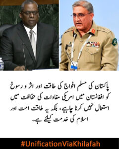 After the destruction of the Islamic foundation Khilafah state, in 1924C all the pillars of Islam fell like never existed the Western colonialists installed rulers over Muslims who ruled by other than all that Allah (swt) has revealed, through the systems of democracy, monarchy and dictatorship. Through the systems of misguidance, the colonists had free hand to make sinful military alliances with Muslim states, inciting them to fight each other, Secularism a “pet name” for kufr DENIAL OF ALLAH AND HIS LAWS WHICH REGULATE LIFE Jumhuriut is now belief of Muslims and world now and democracy is its ruling system capitalism based on freedom of ownership is its economic system and colonialism is foreign policy (which Islam reject) Dhujal paki army general Asim Muni speak of his secular faithless believe Muslims should have interfaith harmony the donkey does not know interfaith harmony in western secular system means abandon Islamic ruling and accept secular way of life