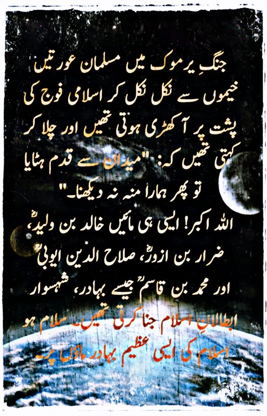 WAR OF YERMOUQ MUSLIM WARRIORS FACED A VERY HEAVY OPPOSITION AND 10 TIME BIGGER ARMY THEIR WOMEN SHOUTED AT THEM DO NOT RETREAT IF U DO DON,T SHOW YOUR FACES TO US SUCH WERE THE MOTHERS IN ISLAM GAVE BIRTH TO KHALID BIN WALEED ZARAR BIN UZVER SALAHUDDIN MOHAMMED BIN QASIM