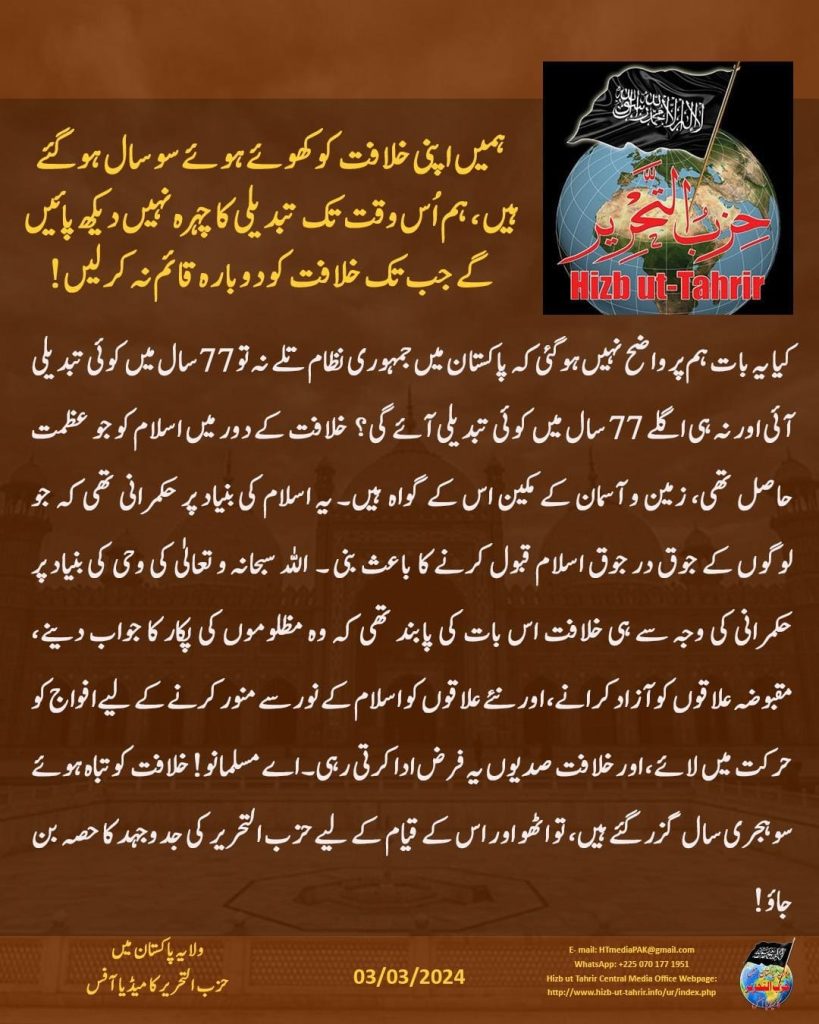 After the destruction of the Islamic foundation Khilafah state, in 1924C all the pillars of Islam fell like never existed the Western colonialists installed rulers over Muslims who ruled by other than all that Allah (swt) has revealed, through the systems of democracy, monarchy and dictatorship. Through the systems of misguidance, the colonists had free hand to make sinful military alliances with Muslim states, inciting them to fight each other, Secularism a “pet name” for kufr DENIAL OF ALLAH AND HIS LAWS WHICH REGULATE LIFE Jumhuriut is now belief of Muslims and world now and democracy is its ruling system capitalism based on freedom of ownership is its economic system and colonialism is foreign policy (which Islam reject) Dhujal paki army general Asim Muni speak of his secular faithless believe Muslims should have interfaith harmony the donkey does not know interfaith harmony in western secular system means abandon Islamic ruling and accept secular way of life