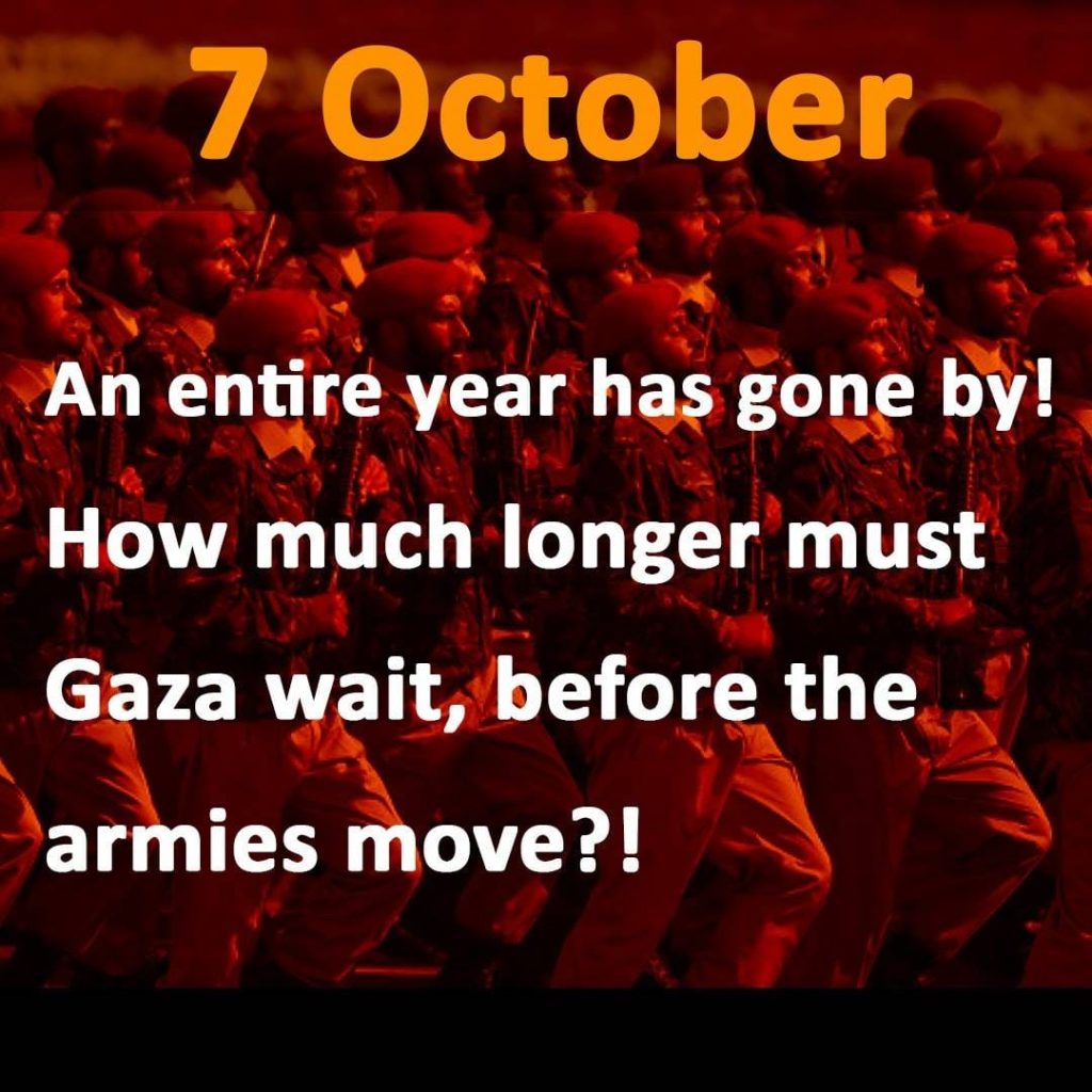 4A GAZA SEVENTH 7 OCT ENTIRE YEAR GONE NONE OF MUSLIM ARMIES MOBILIZED FOR THE SAKE OF ISLAM SURE BURN IN HELL T