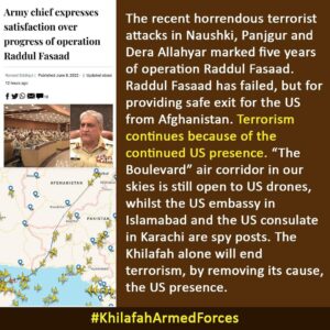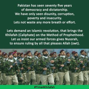 After the destruction of the Islamic Khilafah state, In 1924C the Western colonialists installed rulers over Muslims who ruled by other than all that Allah (swt) has revealed, through the systems of democracy, monarchy and dictatorship. Through the systems of misguidance, the colonists had free hand to make sinful military alliances with Muslim states, inciting them to fight each other, Secularism a “pet name” for kufr. is belief of Muslims and world now And democracy is its ruling system capitalism based on freedom of ownership is its economic system and colonialism is foreign policy (which Islam reject) Dhujal paki army general asim speak of his secular faithless believe Muslims should have interfaith harmony the donkey do not know interfaith harmony in western secular system means abandon islamic ruling and accept secular way of life